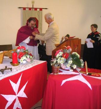 The Vice-President of the South African Relief Organisation of the Order of Malta, Mrs Clare Kalkwarf D.M. presents Fr. Gérard with the cross of a conventual chaplain ad honorem.